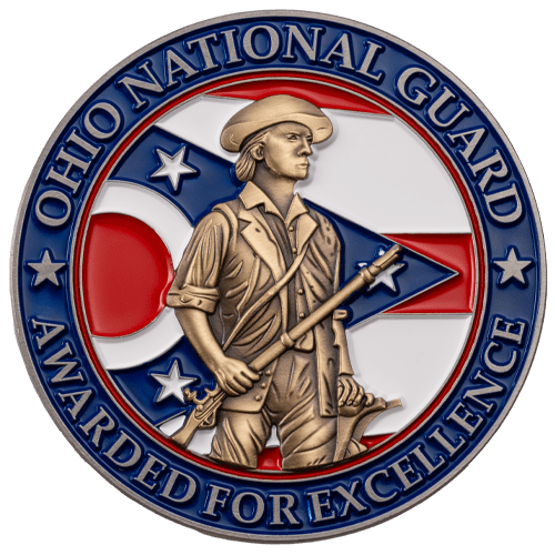 This Army National Guard challenge coin has a classic design that pays homage to the history of the service. A clear coating of epoxy was added over the surface to protect the artwork, giving the coins a smooth texture.